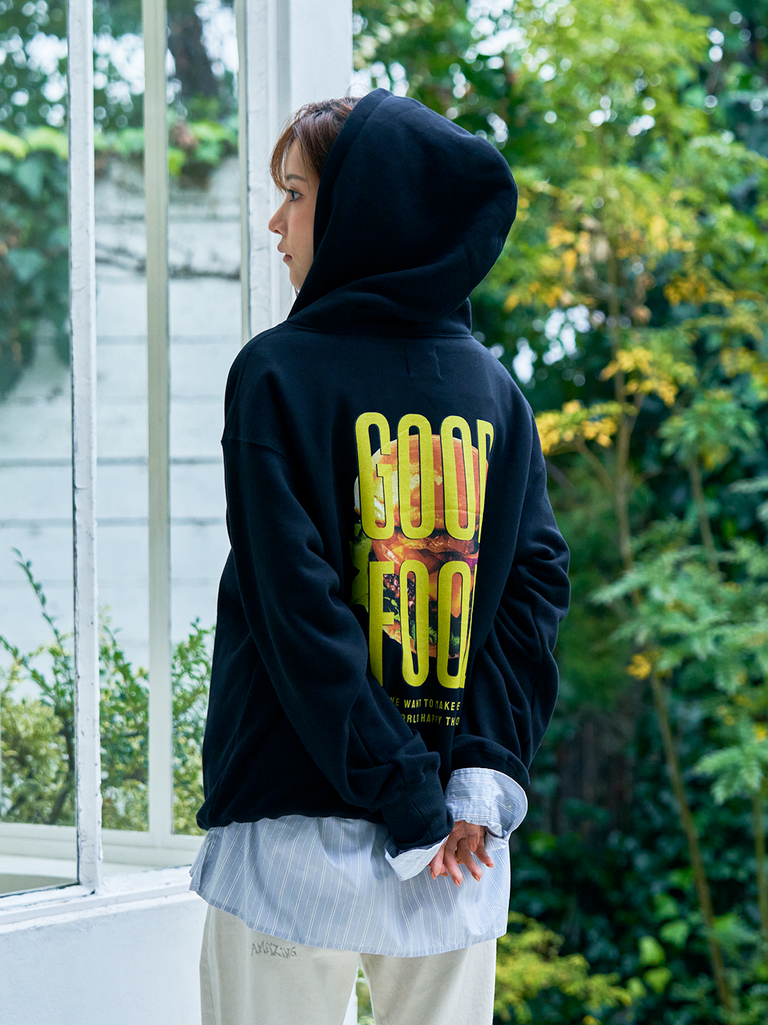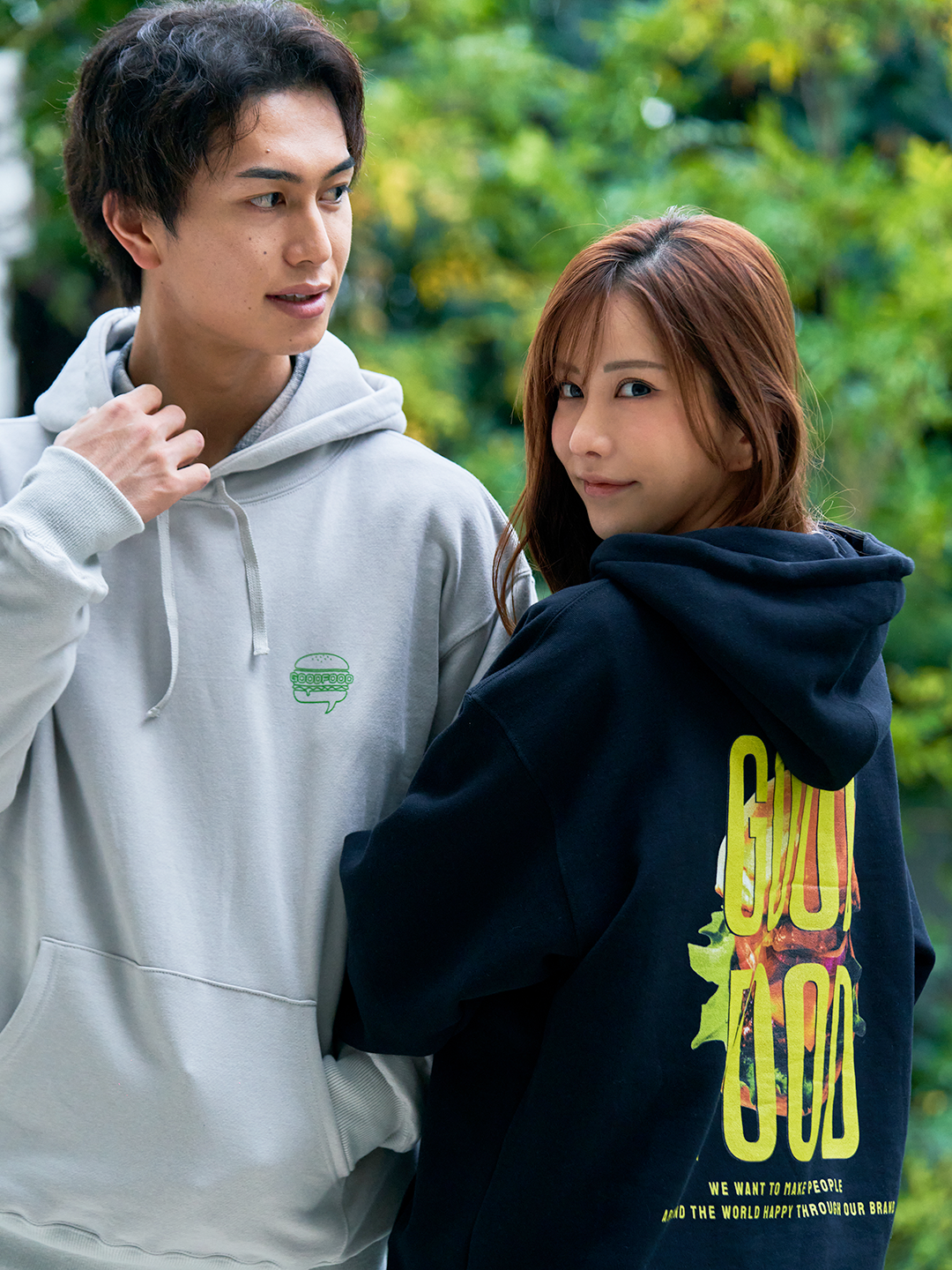 2025年春夏コレクションで大人気を博した「burger T-shirt [GF029]」のデザインテーマを、秋冬シーズンに合わせてアップデート!フロントにはハンバーガーのアイコンを、バックにはジューシーなハンバーガーとブランドロゴを大胆に配置。目にした瞬間、食欲と好奇心がそそられる、GOODFOODならではのアートワーク。リアルな「うまそう」が、ストリートに映える一枚です。