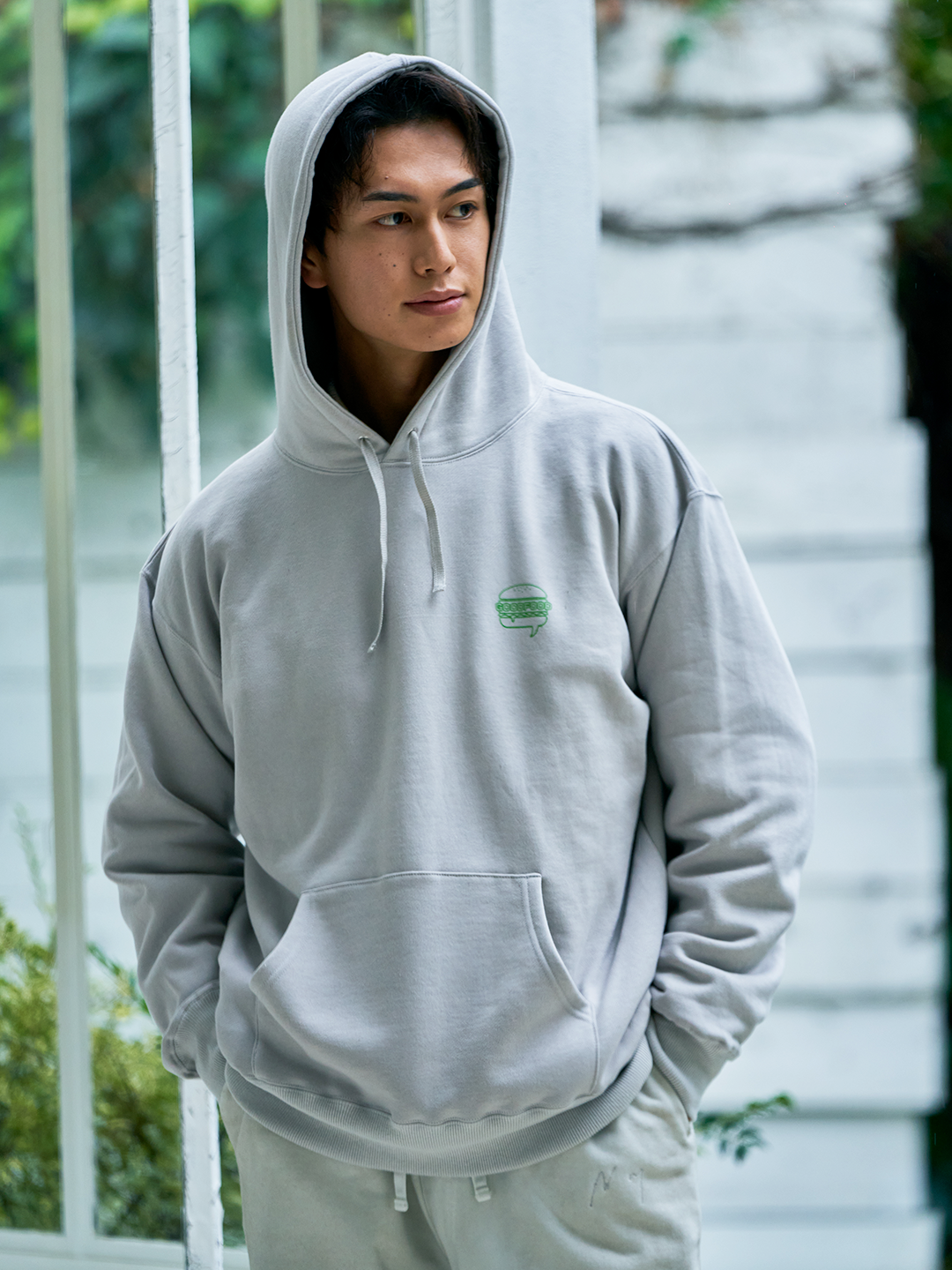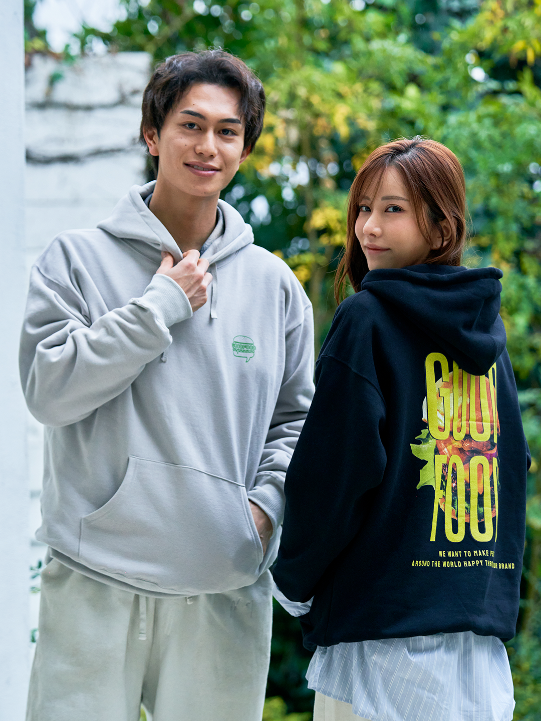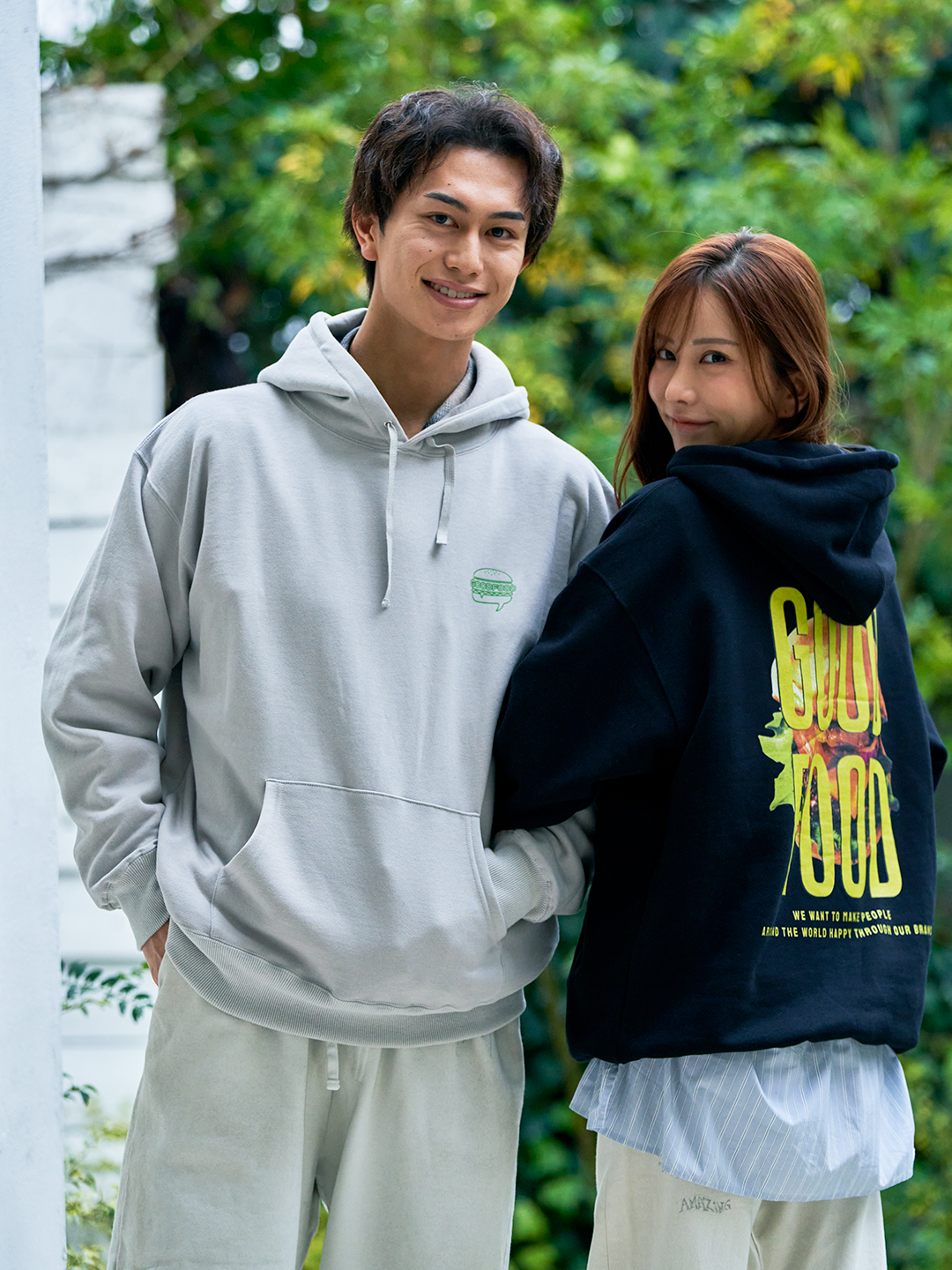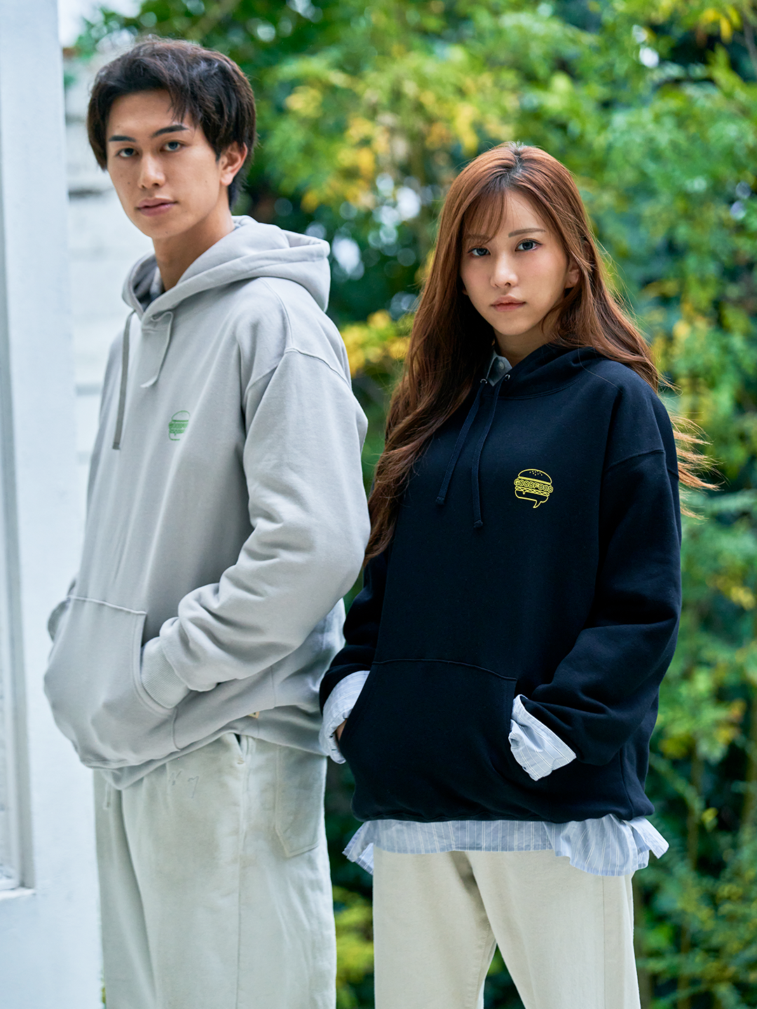 カラー展開:Black:ハンバーガーの線画がクールに映える、落ち着いたこなれ感Gray:抜け感をプラスし、幅広いスタイルにマッチする万能カラー