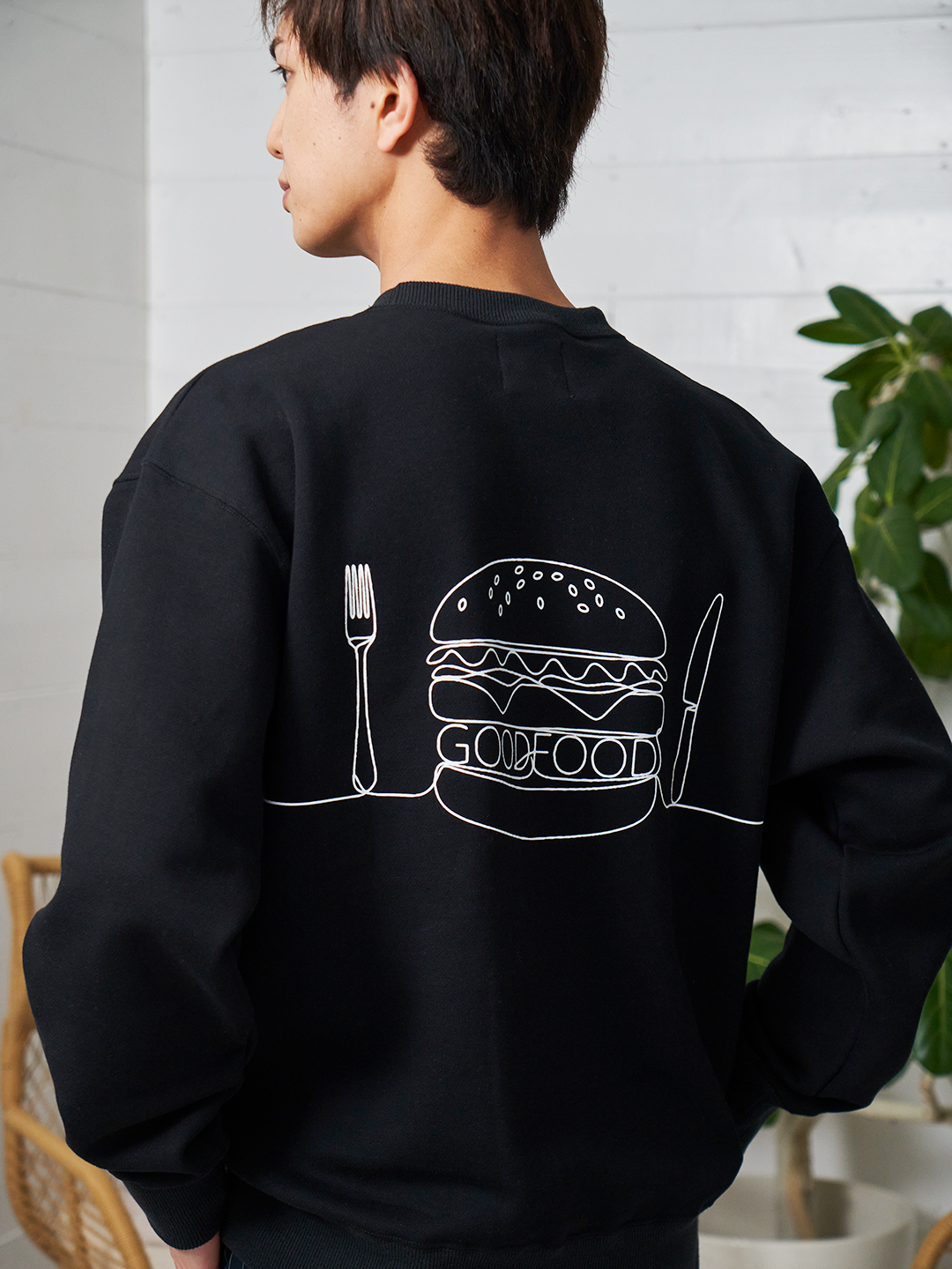 フロントはシンプルに『GOODFOOD』の控えめなロゴを配置。バックスタイルには目を惹くハンバーガーとカトラリーのラインアートプリントしたスウェットシャツです。